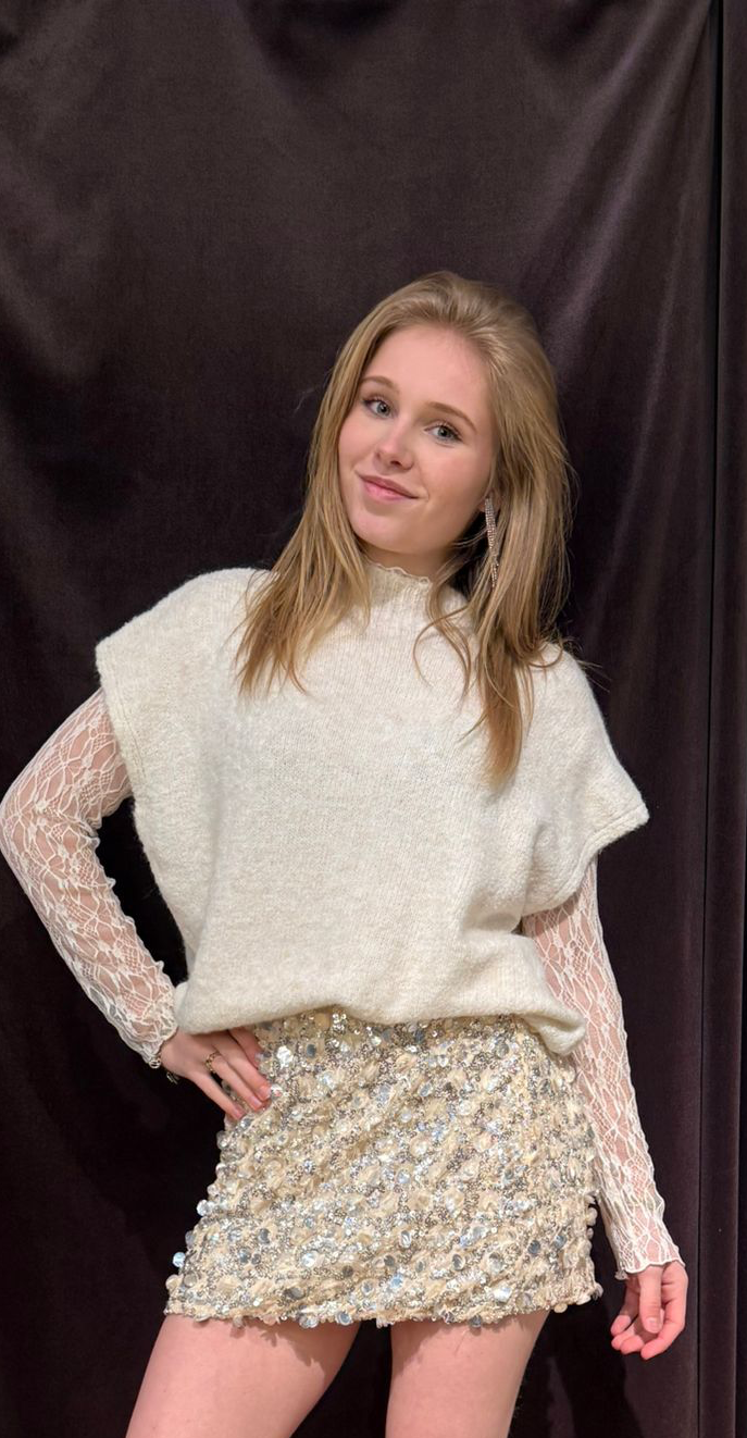 Zachte beige rok met een sprankelende touch van zilveren pailleten.