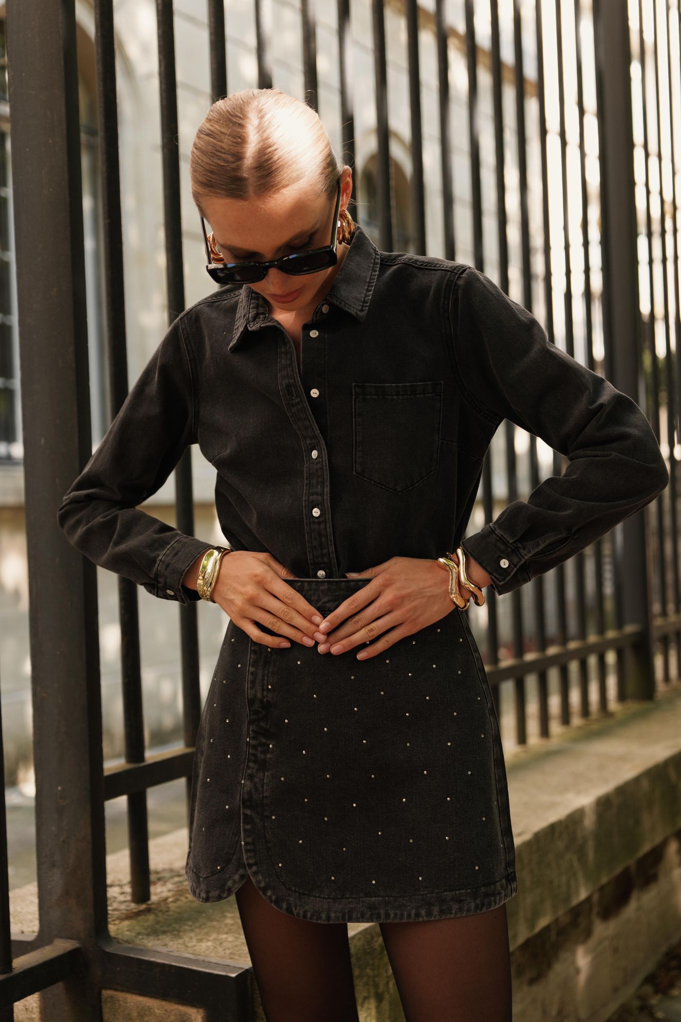Korte stijlvolle jeansrok. Door de kleine sparkle maakt het jou outfit casual en feestelijk in één.