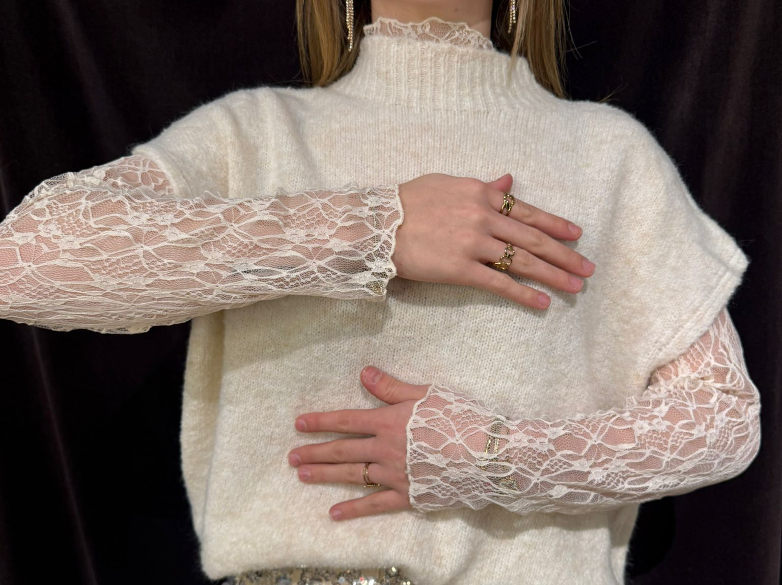 Elegante trui met mooie kanten details op de mouwen en kraag.